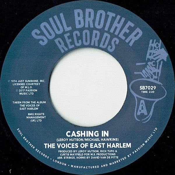 Re-issue on Soul Brother of the amazing soul classic 'Cashing In' by The Voices Of East Harlem. Backed with the equally great 'Take A Stand'.
